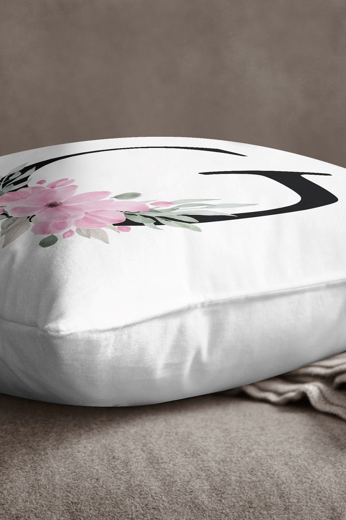 Kadife Babyface Çift Tarafı Pembe Çiçekli Harfli Kırlent Kılıfı - G Harfi