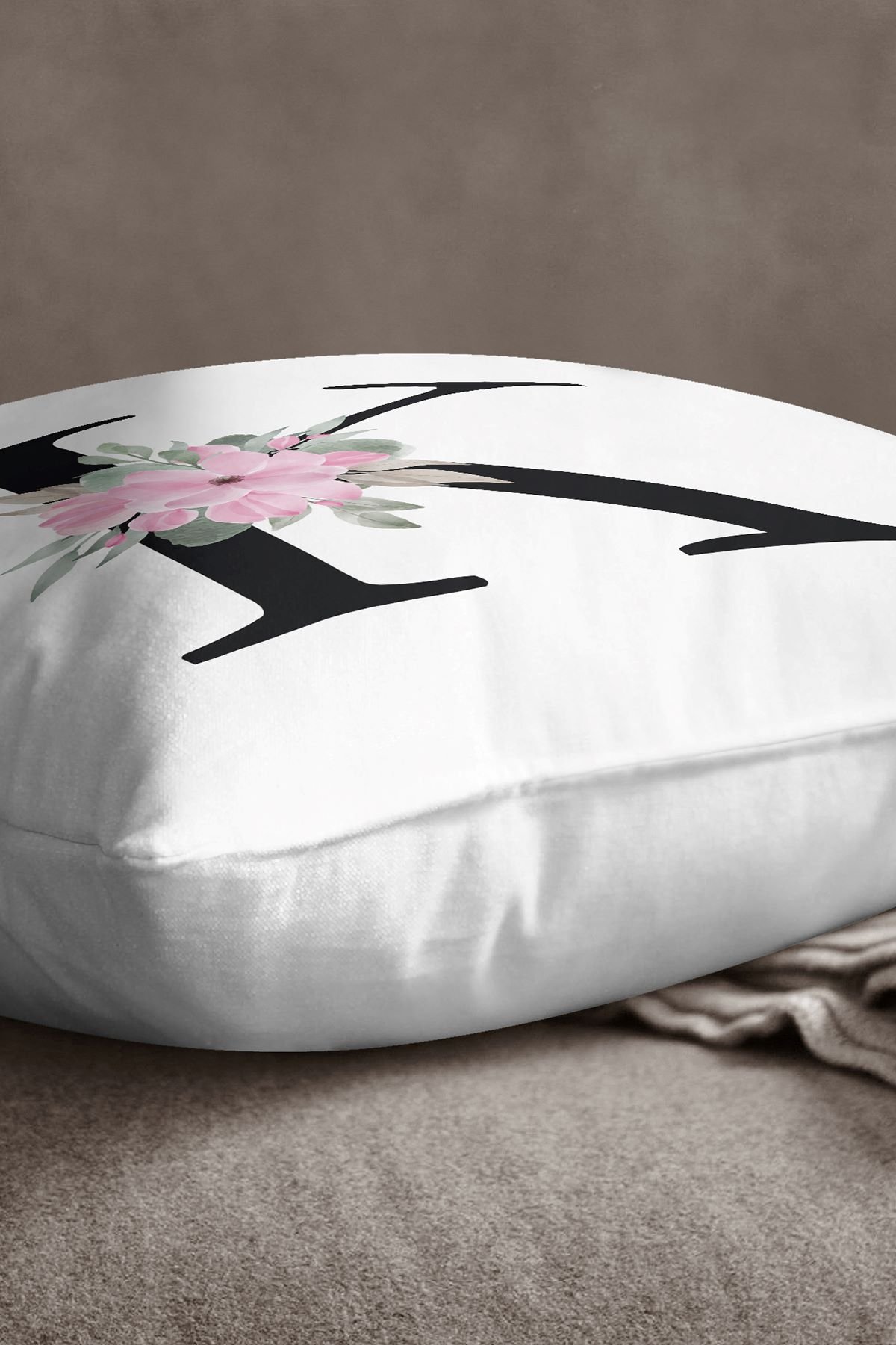 Kadife Babyface Çift Tarafı Pembe Çiçekli Harfli Kırlent Kılıfı - K Harfi