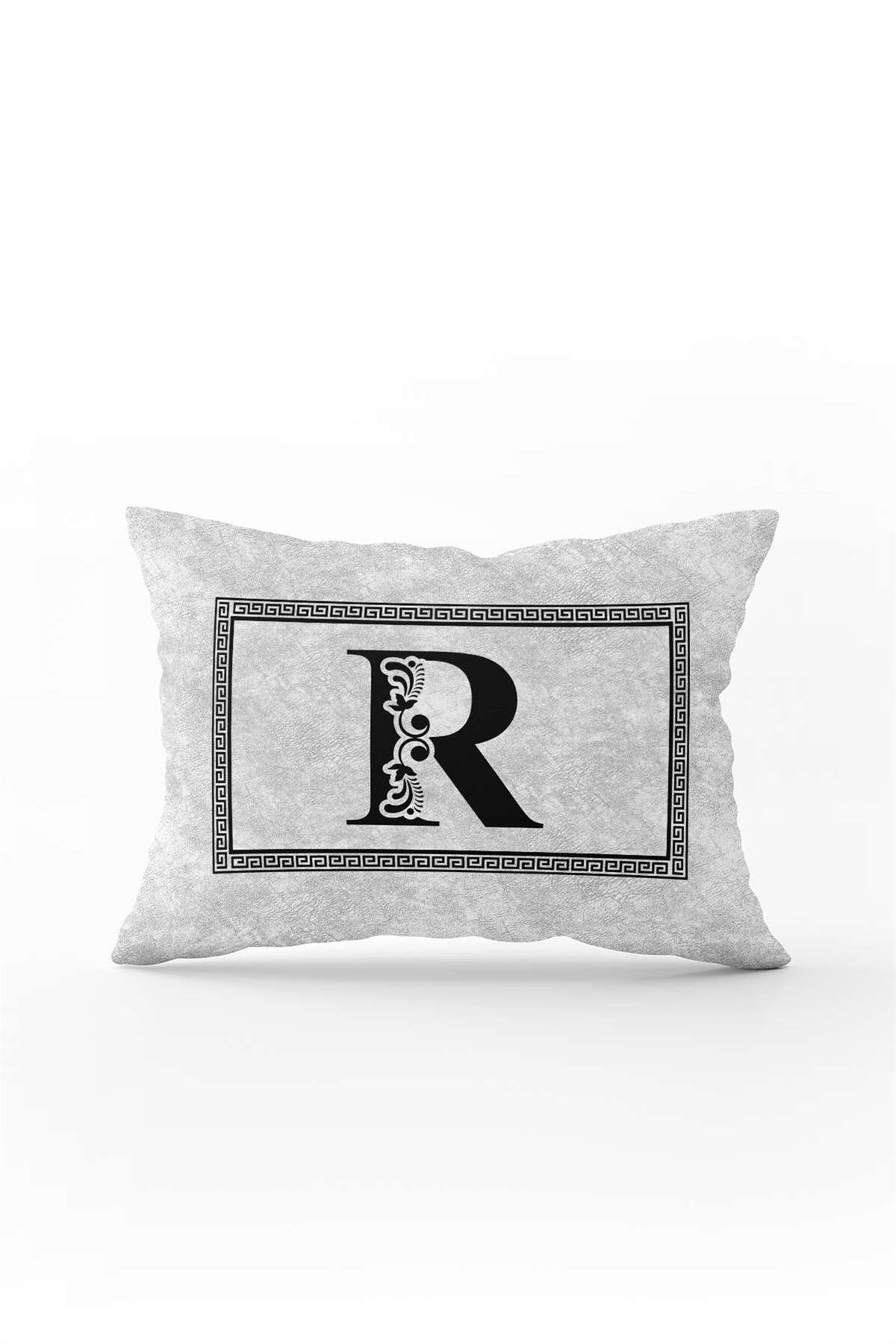 Gri Siyah Harfli Çift Tarafı Dijital Baskılı Kırlent Kılıfı R Harfi