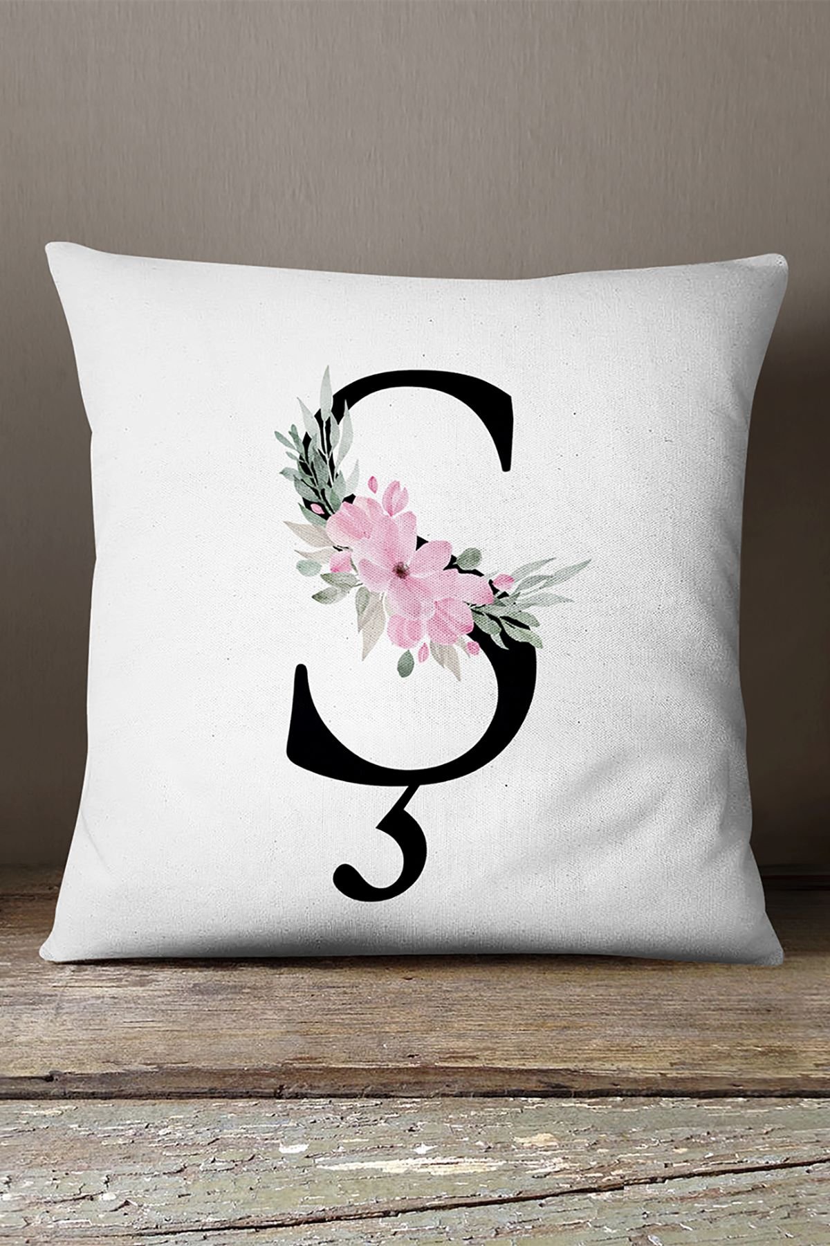 Kadife Babyface Çift Tarafı Pembe Çiçekli Harfli Kırlent Kılıfı - Ş Harfi