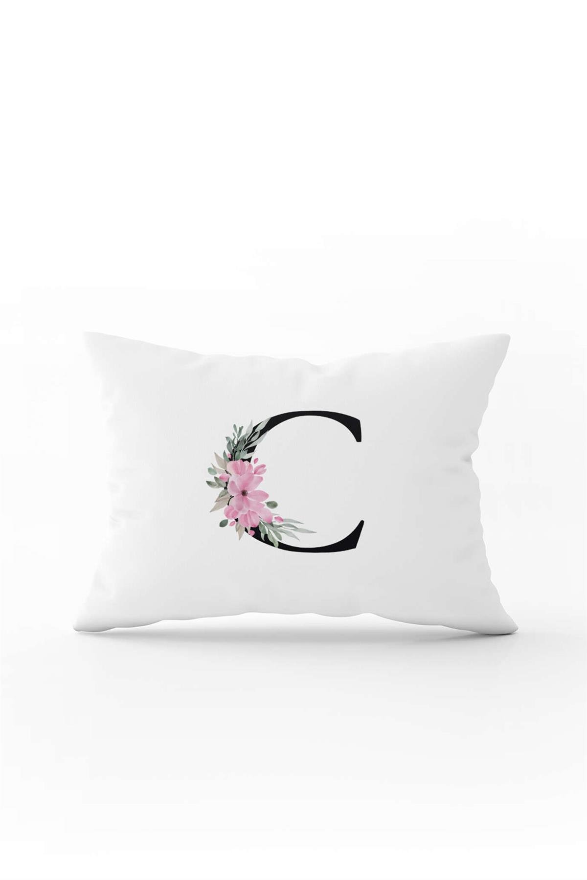 Pembe Çiçekli Siyah Harfli Çift Tarafı Dijital Baskılı Kırlent Kılıfı C Harfi