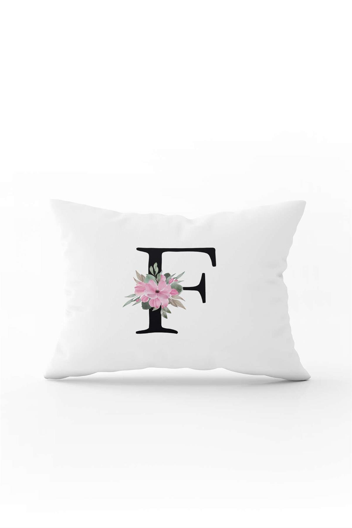Pembe Çiçekli Siyah Harfli Çift Tarafı Dijital Baskılı Kırlent Kılıfı F Harfi