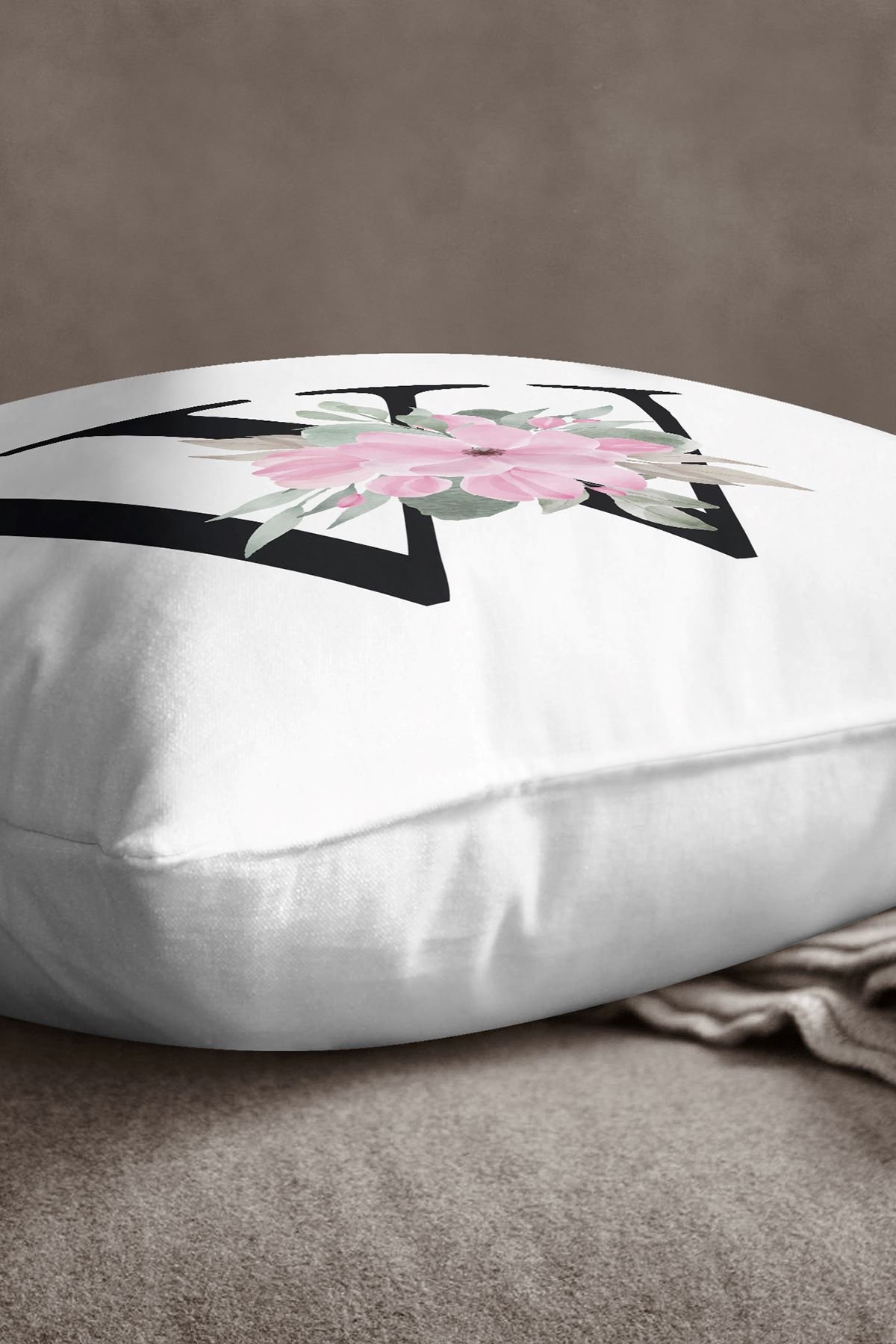 Kadife Babyface Çift Tarafı Pembe Çiçekli Harfli Kırlent Kılıfı - W Harfi